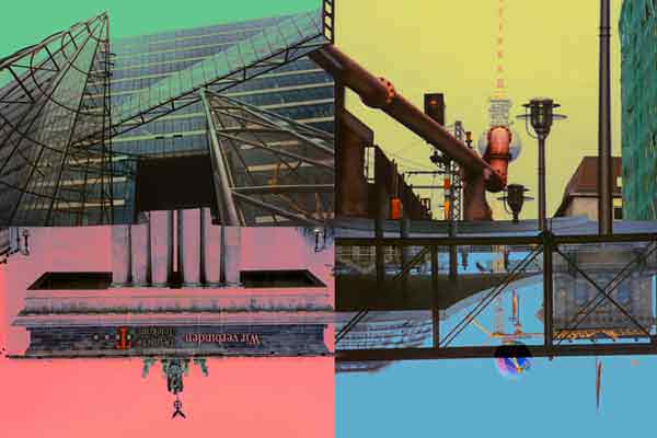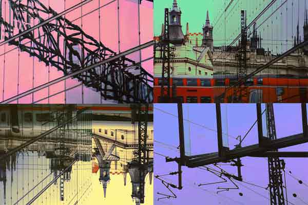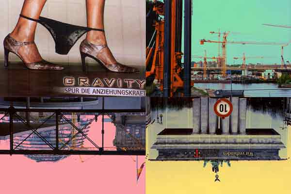 In this series of 12 works, the artist has juxtaposed or contrasted images of this new Berlin in construction, using four photos to create original urban scenes. One can find striking contrasts between the old and the new city as well as ironic architectural dialogues. During the summer of 2002, hjm has created four large new compositions (180cm x 1830cm) for an exhibition in Berlin. Although they are collages of steel structures, fragility breaks through – terror and natural catastrophe threatening whatever mankind may build up.
